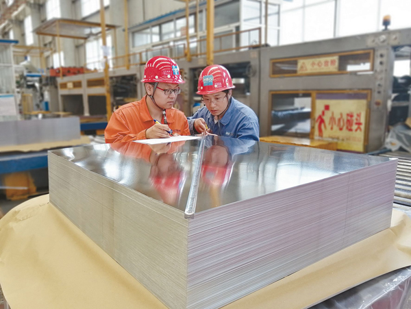 今年初以來(lái),河鋼衡板加大客戶(hù)回訪(fǎng)力度,定期深入客戶(hù)產(chǎn)線(xiàn),了解客戶(hù)需求,及時(shí)調(diào)整產(chǎn)品結(jié)構(gòu),不斷改進(jìn)裝機(jī)水平和工藝條件。上半年,該公司高端鍍錫產(chǎn)品直銷(xiāo)量同比提升 8.91個(gè)百分點(diǎn)。圖為7月5日,該公司檢驗(yàn)人員正在認(rèn)真抽查馬口鐵盒板尺寸。(牛萬(wàn)強(qiáng) 攝)