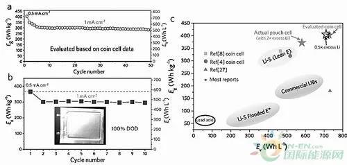此前,關(guān)于鋰硫電池的研究中很少報道全電池的能量密度,尤其是體積能量密度。英國Oxis公司的鋰硫軟包電池的重量能量密度可以達到400 Wh/kg以上,但是體積能量密度只有300 Wh/L左右。目前商用的鋰離子電池能量密度為260 Wh/kg和700 Wh/L左右。