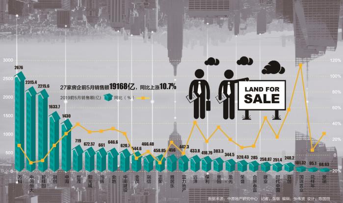 根據易居克而瑞的數據,2019年1-5月,TOP100房企整體銷售業績規模近3.5萬億元,同比微增4.1%。與去年動輒超過30%的增速相比,降幅明顯。