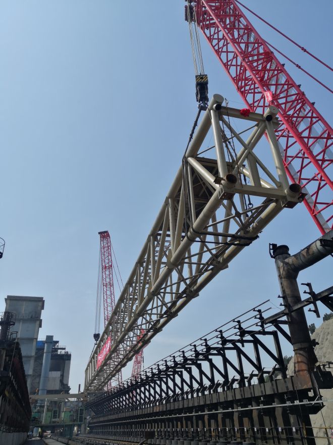 在正式吊裝時,首先通過雙機抬吊將重量440噸、長度120米的主桁架繞過滑線,從兩臺履帶吊之間繞過至機側推焦機軌道間空中。隨后,再帶負荷局部走行,調整吊裝姿態,穩定桁架。最后,將端臺1000噸履帶吊增加至370噸超起配重與間臺1250噸履帶吊一起將桁架抬吊至爐頂已經安裝就位的門型支架上就位。在3臺汽車吊的輔助下,兩臺大型履帶吊順利完成了穿鋼絲繩、起鉤、增超起配重、跨過滑觸線、抬吊負載行走、空中繞桁架、起吊就位、摘鉤、取鋼絲繩等多個高難度動作。至此,標志著國內焦化企業在焦爐生產狀態下超大型構件吊裝的首次完成,并開啟了國內焦化行業最大履帶吊裝的新征程。