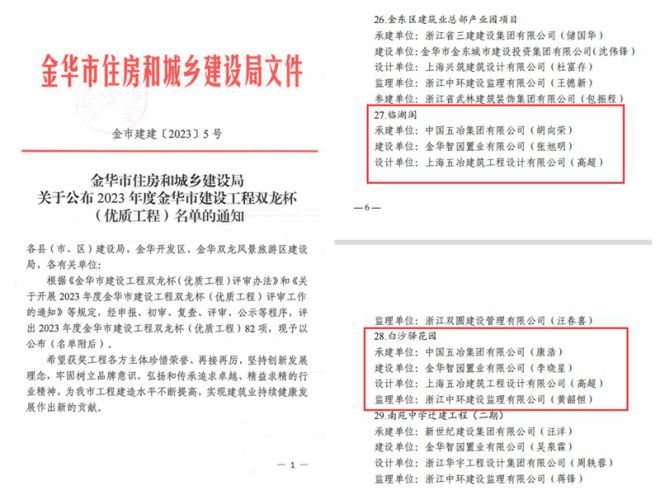 近日,中國五冶集團承建的臨湖閣項目和白沙驛花園項目榮獲2023年度金華市建設工程雙龍杯(優質工程)。