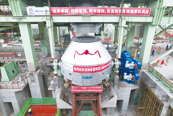 中冶賽迪承擔了該項目的煉鋼連鑄、4200毫米寬厚板生產線、8萬立方米煤氣柜及中水深度處理等工程建設重任。其中,煉鋼連鑄生產線采用中冶賽迪四點連桿下懸掛轉爐、KR鐵水脫硫、轉爐副槍和智能氧槍、轉爐一次干法除塵、連續彎曲連續矯直變輥徑輥列連鑄機及自動幅切及高效智能反沖洗二冷噴淋、基于包絡線的結晶器在線熱調寬、結晶器專家系統、三維動態二冷配水及高精度動態輕壓下、高可靠性免維護蝶式回轉臺、高精度結晶器液壓振動、高輥縫精度扇形段,輔以一鍵脫硫和自動扒渣、自動出鋼、一鍵精煉、連鑄機器人、煉鋼和連鑄集中管控、車間智能物流等技術,有效提升煉鋼智能化水平,提高勞動生產效率,確保鑄坯質量,實現全系統超低排放;4200毫米寬厚板生產線主軋機選用高剛度、大軋制力矩的四輥軋機,采用先進可靠雙蓄熱式智能化加熱爐、高效節能高壓水除鱗、高冷速率超快冷卻裝置、全液壓矯直機、在線自動探傷裝置、滾切剪、無氧化輥底式熱處理爐、輥壓式淬火機、設備狀態在線監測診斷、鋼軋一體化排產等先進工藝裝備技術20余項,整體技術裝備水平國內領先,實現寬厚板生產線全自動、高精度、高品質、低成本生產。