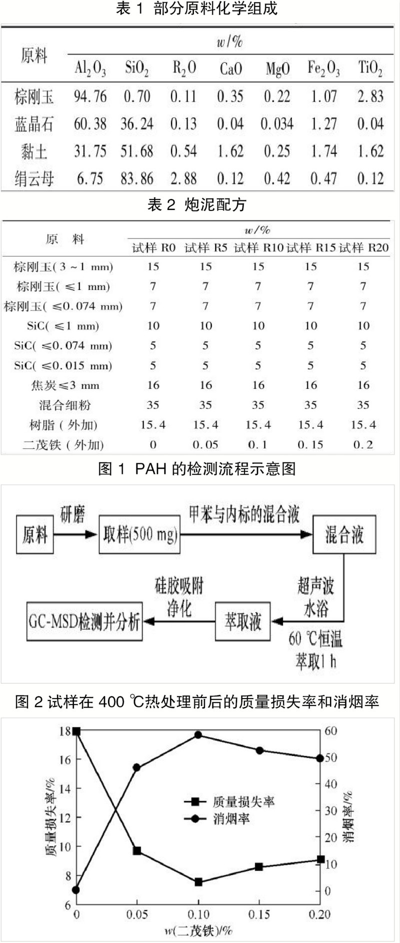 為了進一步降低炮泥的煙氣量,改善爐前作業(yè)環(huán)境,在本工作中,選用二茂鐵為消煙劑,首先探究了二茂鐵對樹脂和瀝青的消煙效果和消煙機制,然后研究其加入量對炮泥各種性能的影響。