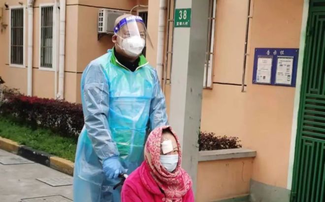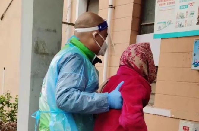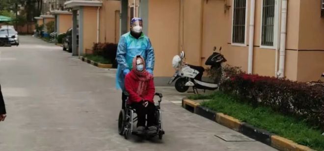 4月1日,在排隊(duì)做核酸的人群中,有一個(gè)老人坐在路邊,志愿者過(guò)去詢問(wèn)后,得知她是孤寡老人,連忙推來(lái)輪椅車,直接給她做了核酸檢測(cè),然后又把她推到樓下并攙扶她回到家中。