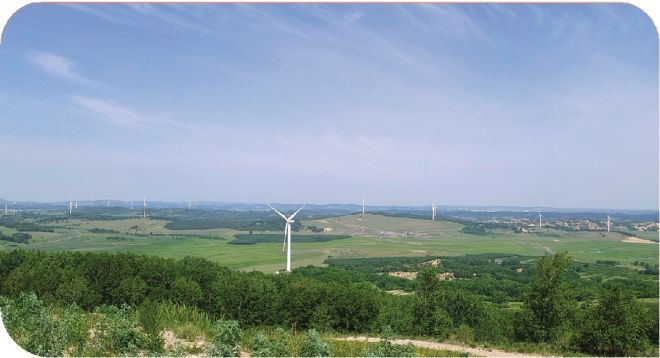 站在桃山頂,放眼望去:林海無垠、草原壯闊、濕地廣袤、風車(風力發電機)高聳,散布其間的護林防火小紅旗迎風招展。遠處,一大一小兩個湖泊——桃山前湖和桃山后湖在陽光映照下,如同綠草甸上的藍寶石,亮得耀眼……
